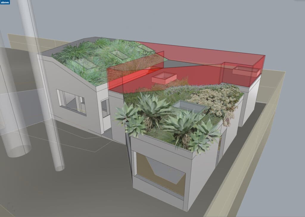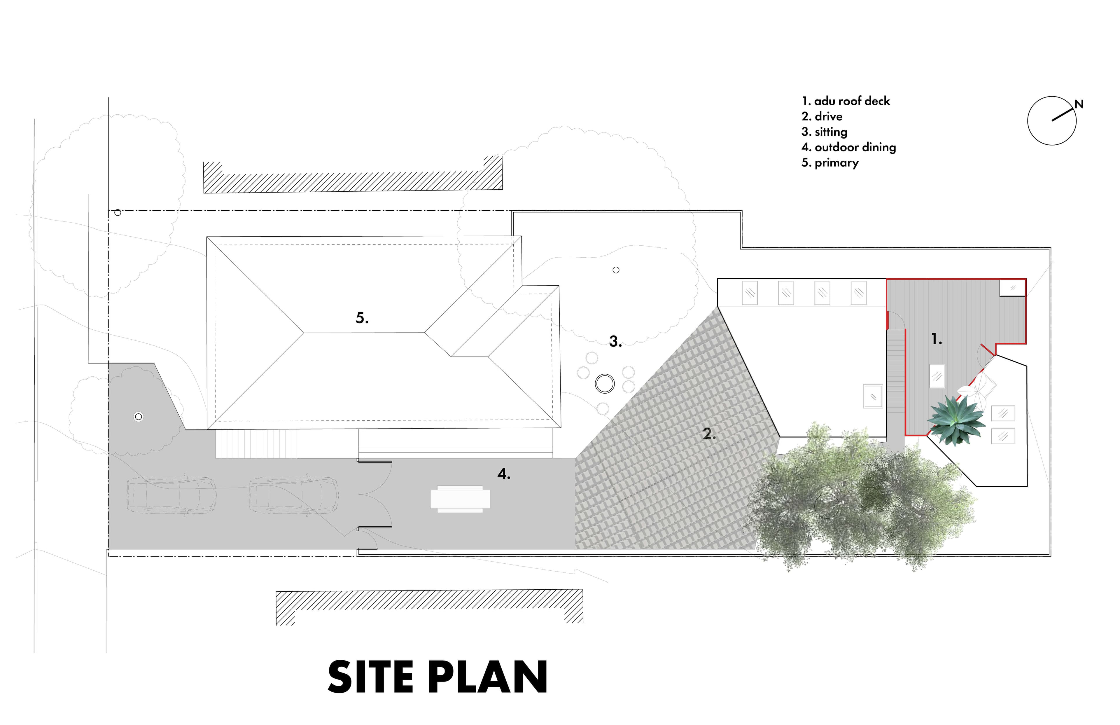An ADU and garage / workshop for a multigenerational family. The goal was to densify the lot by adding an additional unit that could meet the demands of a multitude of living arrangements. A portion of the lost yard space will be replaced with a roof deck and garden accessed by an exterior stair. The concrete retaining wall extends from the site’s high point and is expressed on the interior and exterior. The wall becomes a unifying datum throughout the programs.