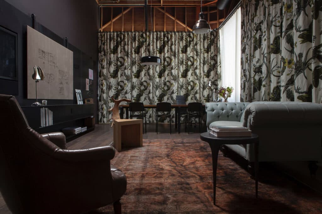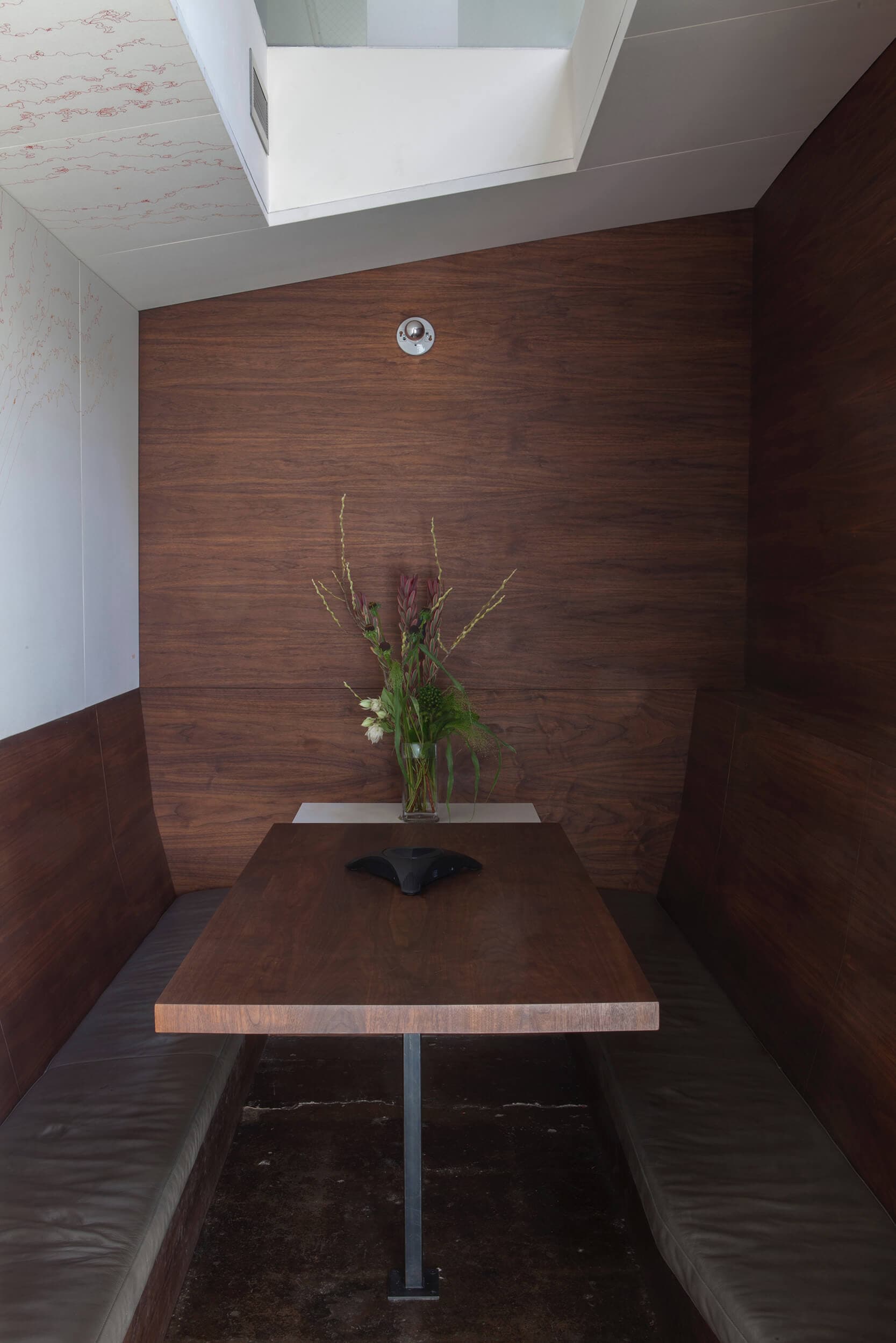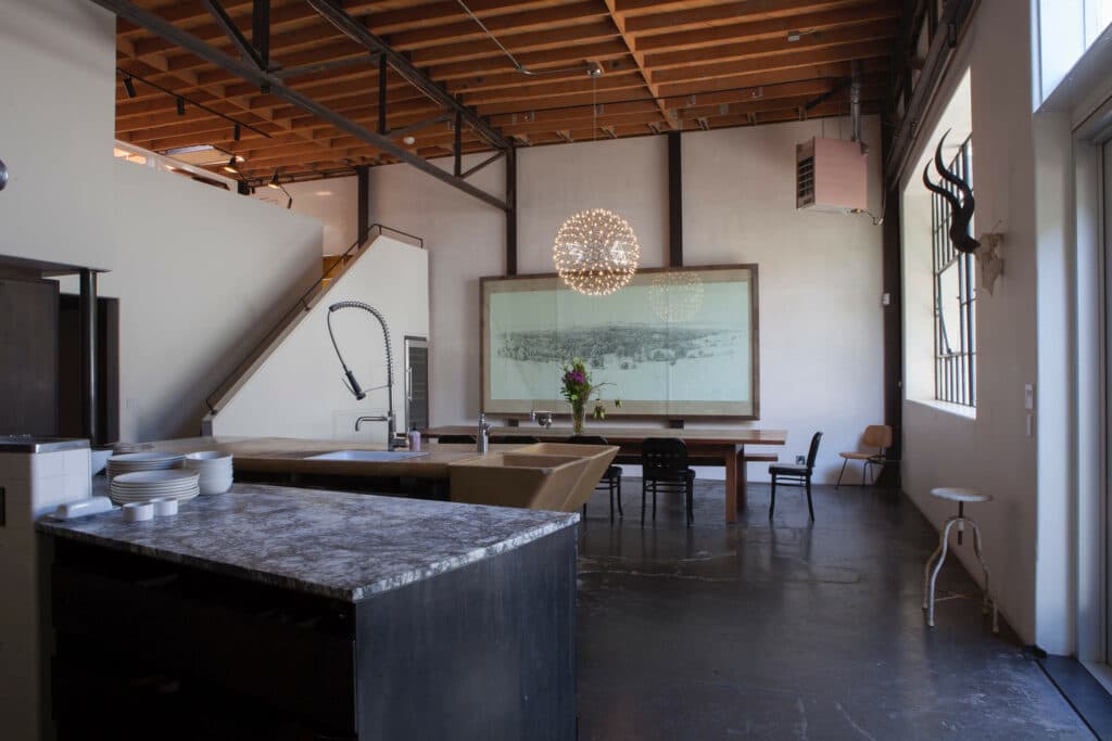 The open workspace (factory), adjacent kitchen and courtyard comprise the majority of the floor plan for the creative firm. Unconventional materials and comfortable spaces foster a collaborative work environment and embody the firm’s values.